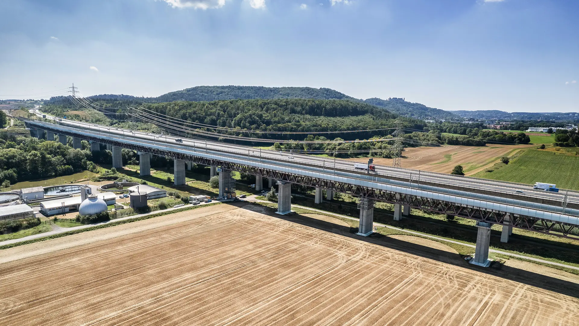 Roedental, Germany – It is more than 20 years old, has a total of 14 pier caps and bases, and is made up of a 868 m steel composite structure: the Itztal bridge railway overpass. The railway bridge with a height of roughly 30 m is part of the high-speed railway line through the Thuringian Forest and runs between the towns of Roedental and Doerfles-Esbach in Upper Franconia. The problem? Fractures in the pier caps caused by incipient chemical attack reactions in the concrete, which leads to efflorescence and fractures in the concrete support structures of the piers as a result of moisture. To safeguard the stability of the Itztal bridge on the long term and prevent the ingress of water, SPESA Spezialbau und Sanierung GmbH was tasked along with the steel construction experts from SCHACHTBAU NORDHAUSEN GmbH to carry out extensive concrete rehabilitation and steel reinforcement measures. After a construction period of roughly one year, the order was successfully concluded in June 2024, a subcontracted service on behalf of DB Bahnbau Gruppe GmbH as main contractor for DB InfraGO AG.
