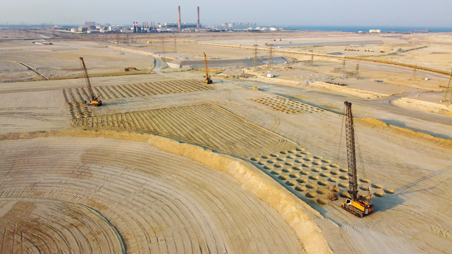 Soil compaction for the Sabah Al Ahmad Sea City construction project – a total of six BAUER MC duty-cycle cranes are being used in Kuwait under extreme conditions.